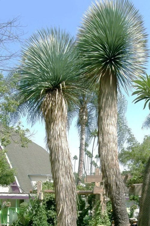 An extremely cool plant in every way, and highly ornamental and hardy, the Yucca rostrata, commonly known as Big Bend Yucca or Beaked Yucca, is a tree-like North American native species. Though it naturally inhabits western Texas and northern Mexico, where it can be found thriving on rocky slopes and ridges, it does well in other regions of the country in USDA Zones 5 to 11, which means it’ll handle temperatures down to -20F, or the most heat you can throw at it to Zone 11. When young, it looks more like a rounded shrub, but as it grows it forms an upright tree with a beautiful pom-pom-like, perfectly symmetrical globe of hundreds of soft, narrow, 2 foot long light gray-blue leaves. As it grows taller the old leaves fall off, or can be removed, which exposes the fibrous soft gray covering on the trunk. Large clusters of white, bell-shaped flowers on golden orange stalks tower above the foliage in late spring to early summer, depending on location. Performing best in well-drained to even rocky and sandy soils, Big Bend Yucca makes for a fine vertical accent tree or grouping in sunny to partially shaded rock gardens, landscape borders, and home foundation plantings. We suggest a minimum of 3 hours direct sunlight and good soil drainage.