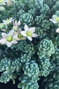 Exceptionally easy to grow and drought tolerant, the Blue Tears Sedum, also called Corsican Stonecrop, is a low growing, mounding succulent plant perfect for use in well-drained garden beds and container gardens. Its dense foliage to 4 inches tall has small powdery blue succulent leaves that take on a mauve cast with the arrival of cool temperatures in fall and winter. From late spring to mid-summer, butterflies will thank you for the pretty clusters of star-shaped white flowers that rise just above the foliage.