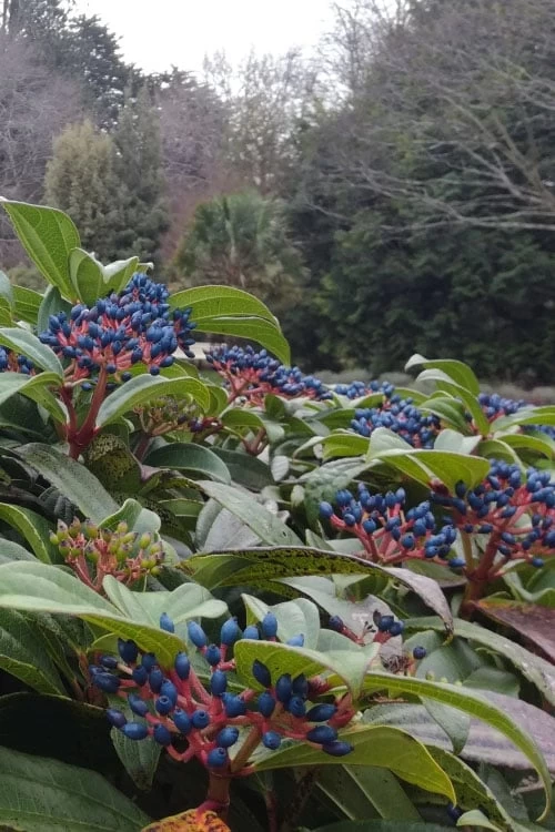 An oldie-but-goodie introduced in 1904 by E.H. Wilson, the David Viburnum has stood the test of time for very good reasons: gorgeous foliage, pretty flowers and colorful berries. A slow grower, it forms a compact mound to maybe 4 feet tall and wide clothed in some of the most attractive foliage of any evergreen shrub. The thick, leathery, elliptic-oval leaves up to 6 inches long are dark blue-green and deeply veined. In mid spring, abundant clusters of pinkish buds open to pretty white flowers that contrast beautifully with the dark foliage. Flowers can be followed by tubular shaped bright blue berries like no other viburnum on female plants. Butterflies enjoy the flowers and birds love the berries. In fall the foliage takes on an attractive burgundy tone that turns back to dark green when temperatures warm in spring, at which time new leaves emerge a burgundy color. Very low maintenance, we’ve seen no pest or disease problems and deer haven’t shown an interest in our gardens. In hot-summer climates it will appreciate some filtered sun or shade during the afternoon hours. An excellent shrub for home foundation plantings and sunny to partially shaded landscape borders.