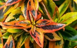 Kaleidoscope Abelia provides constantly swirling color throughout all the seasons on evergreen foliage. It displays variegated bright yellow and green foliage during the warm season that changes to brilliant shades of red and deep orange during the winter months. Then, when soil starts to warm up in spring light orange new growth emerges that turns to yellow. The foliage does not bleach in the sun.