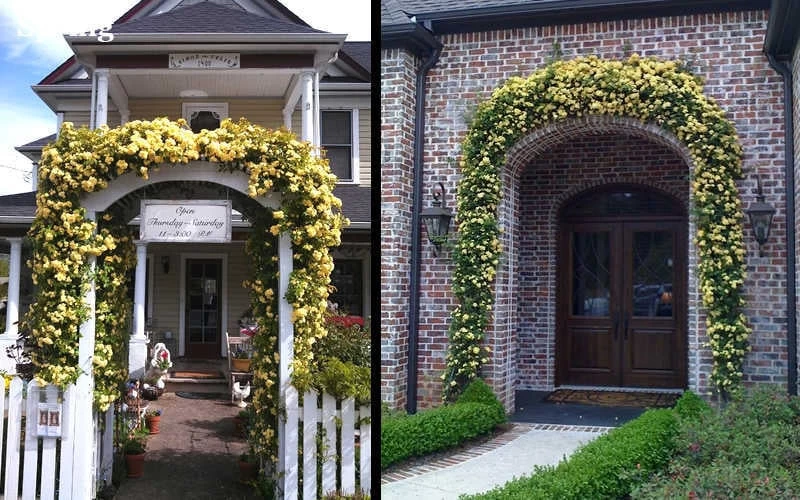 As a climber the Lady Banks Rose can achieve heights of 30 feet or more, with support. It is ideal for use as a climber to grow along a sturdy fence or to cover large arbors and other structures. If planted too closely to the front porch it’s possible it might take over your entire house…a slightly overwhelming prospect that is tempered only by the breathtaking display of flowers dripping from the soft, green branches. This could be a desirable attribute if you have a large, unsightly old shed or other structure you want to cover. If you don’t mind training or pruning it, Lady Banks a great rose for growing up large columns or porch posts in home foundation plantings. Just know that you’ll be doing a considerable amount of pruning. Also keep in mind that it blooms on old wood (last years growth), so be careful not to over-prune the older branches.