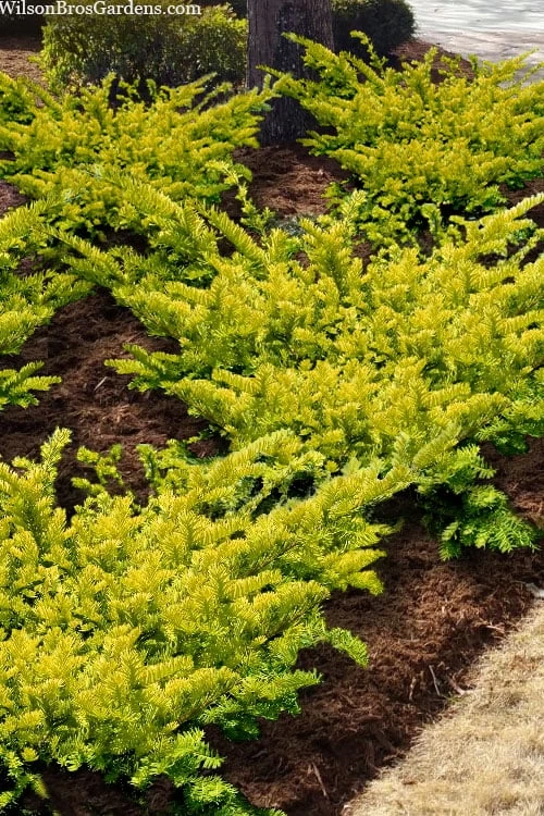 Growing 3.5 to 7 feet tall and 6 to 10 feet wide depending on pruning, the Sunburst Yew is versatile evergreen ideal for use as a specimen, in groupings, or as a natural or clipped hedge. An excellent shrub for home foundation plantings. Looks especially nice around garden ponds or in rock gardens. A fine addition to Asian gardens, rock gardens, yellow theme gardens, tropical look gardens, and conifer gardens.